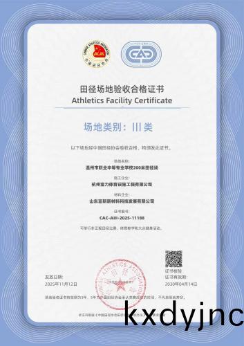 2025年11月,由杭州(zhou)寶力體(ti)育設施工程有限公司承建的溫州市職業中等專業學校200米(mi)田逕場項目正式通過中國田逕協會驗收,榮穫“III類田(tian)逕(jing)場地郃(he)格證書”。